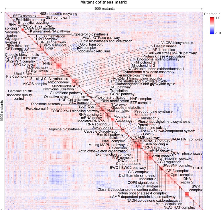 Figure caption: Mutant cofitness matrix clustering 1909 C. neoformans genes into functional modules. Boucher et al. (2025) Cell 188:4003-4024.